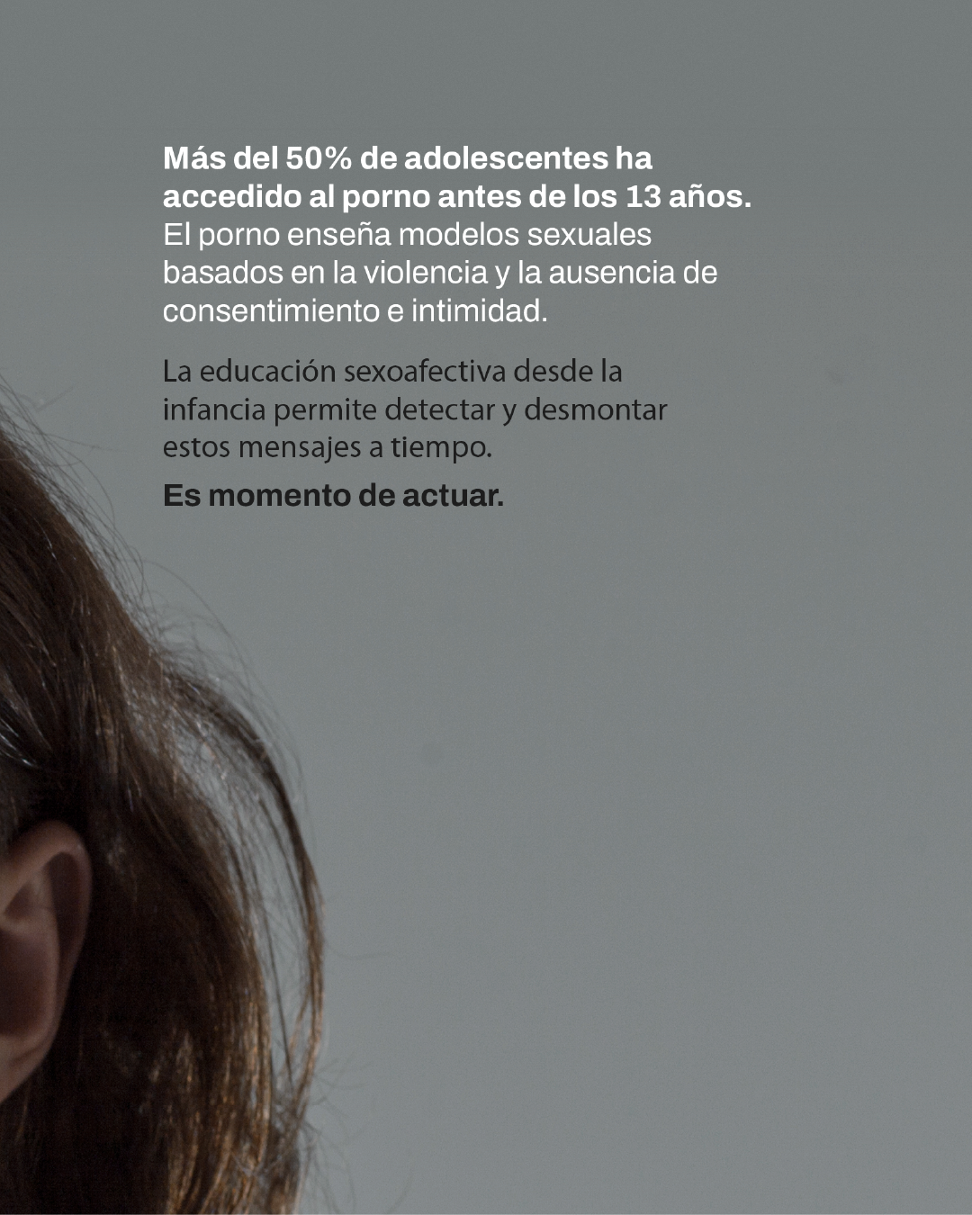 Lanzar una campaña que haga un llamado social a fortalecer la educación sexoafectiva como respuesta a la influencia del porno. Una acción que no se limite a señalar el problema, sino que invite a hablarlo: a cuestionar, dialogar y educar desde el afecto y la empatía. La campaña vincula el consumo de porno con problemáticas concretas , como la normalización de violencias, la desconexión emocional o la construcción de roles de género, con el objetivo de despertar conciencia y promover una conversación colectiva sobre el tipo de relaciones que queremos construir.